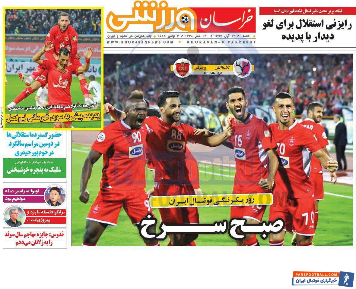 عناوین روزنامه خراسان ورزشی شنبه ۱۲ آبان ماه به شرح زیر است :