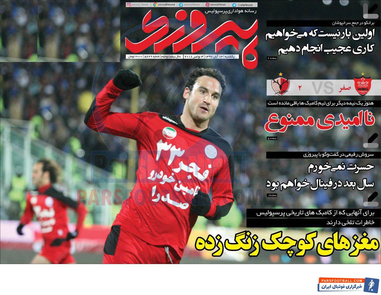دکه پارس فوتبال؛ روزنامه پیروزی؛ ناامیدی ممنوع:پرسپولیس تیمِ کامبک های بزرگ؛ برای آنها که از کامبک های تاریخی پرسپولیس خاطرات تلخی دارند:مغزهای کوچک زنگ زده؛ برانکو:اولین بار نیست که میخواهیم کارهای عجیب بکنیم