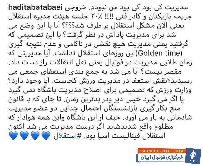 هادی طباطبایی، پیشکسوت تیم فوتبال استقلال، در واکنش به این تصمیمات، در پیام اینستاگرامی انتقاد دیگری را نسبت به مسئولان باشگاه و همچنین وزارت ورزش بیان کرد.