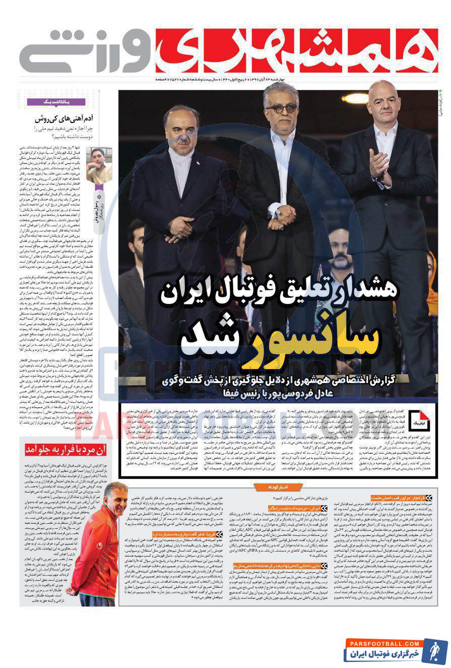 عناوین روزنامه همشهری ورزشی چهارشنبه ۲۳ آبان ماه به شرح زیر است :