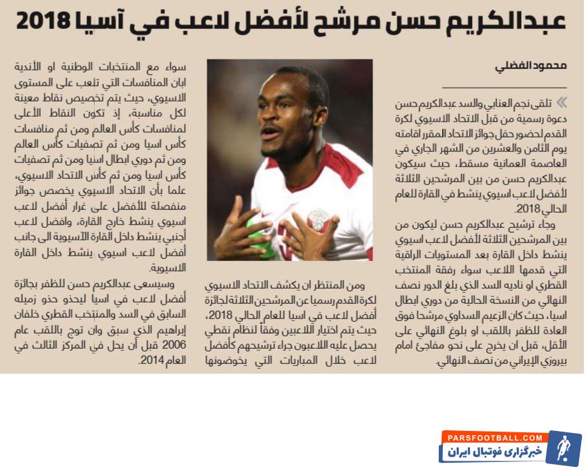 امروز سایت استاد الدوحه در گزارشی اعلام کرد عبدالکریم حسن مدافع تیم ملی فوتبال قطر و باشگاه السد از سوی کنفدراسیون فوتبال آسیا به عنوان یکی از ۳ نامزد نهایی مرد سال انتخاب شده است. در این گزارش آمده که فدراسیون قطر و باشگاه السد نامه رسمی برای حضو حسن در مراسم گالای آسیا از سوی ای اف سی را دریافت کرده اند تا این مدافع ۲۵ ساله با حضور در مراسم مسقط عمان شانس بهترین بازیکن قاره کهن شدن را داشته باشد.