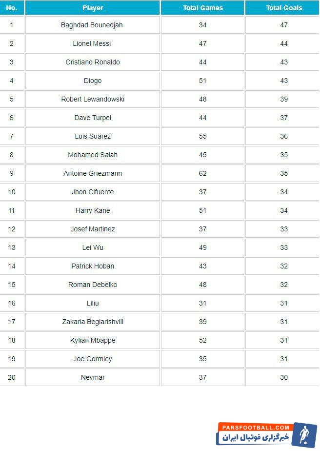 در کمال شگفتی، بغداد بونجاح الجزایری در سال ۲۰۱۸ بیشتر از مسی گلزنی کرده و نرخ گلهای به ثمر رسیده در هر بازی بغداد بونجاح هم از رونالدو بیشتر است. بغداد بونجاح مهاجم ۲۶سالهی الجزایری در تنها ۲۷ بازی خود برای باشگاه السد قطر در لیگ ستارگان قطر و لیگ قهرمانان آسیا ۴۲ گل به ثمر رسانده و در هفت بازیای که برای تیم ملی کشورش الجزایر به میدان رفته هم ۵ گل به ثمر رسانده.