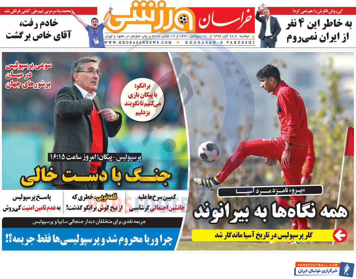 عناوین روزنامه خراسان ورزشی دوشنبه ۲۸ آبان ماه به شرح زیر است :