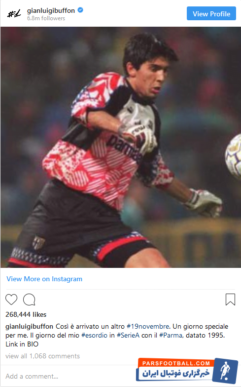 روز گذشته سالروز اولین بازی جان لوئیجی بوفون در سری آ ایتالیا، برای تیم فوتبال پارما بود. او از این روز به عنوان یک روز ویژه و خاص یاد کرد.