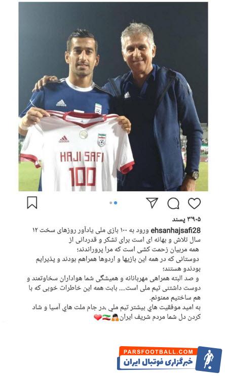 احسان حاج صفی ، کاپیتان سوم کشورمان، امشب صدویکمین بازی خود با پیراهن تیم ملی ایران را انجام داد و در پستی اینستاگرامی نوشت: