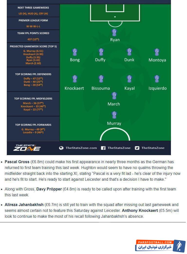 به این ترتیب علیرضا جهانبخش در بازی حساس امشب ورزشگاه کینگ پاور غایب بزرگ برایتونی ها لقب خواهد گرفت تا آنتونی نوکارت فرانسوی رقیب اصلی او در مقابل تیم سابقش باز هم به ترکیب اصلی بازگردد.