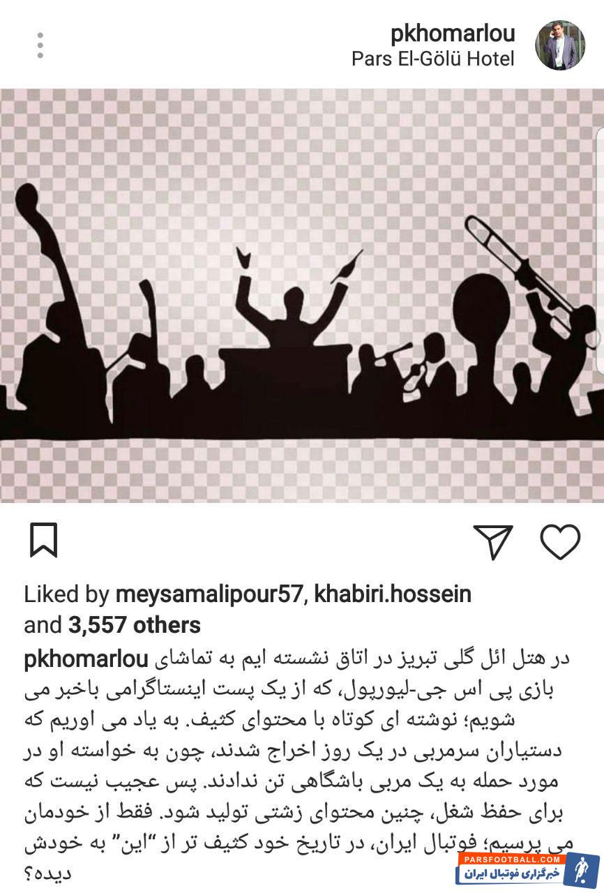 در هتل ائل گلی تبریز در اتاق نشسته ایم به تماشای بازی پی اس جی-لیورپول، که از یک پست اینستاگرامی باخبر می شویم؛ نوشته ای کوتاه با محتوای کثیف. به یاد می اوریم که دستیاران سرمربی در یک روز اخراج شدند، چون به خواسته او در مورد حمله به یک مربی باشگاهی تن ندادند. پس عجیب نیست که برای حفظ شغل، چنین محتوای زشتی تولید شود. فقط از خودمان می پرسیم؛ فوتبال ایران، در تاریخ خود کثیف تر از “این” به خودش دیده؟
