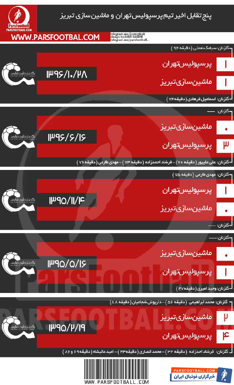ماشین سازی تبریز در پنج دیدار اخیر خود موفق نشده است مقابل پرسپولیس به پیروزی دست پیدا کند و پرسپولیس تهران موفق به کسب چهار پیروزی شده است.