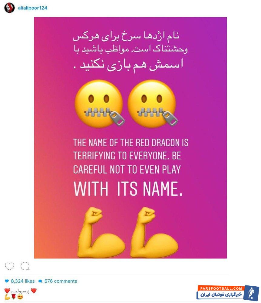 تیم پرسپولیس روز گذشته در تبریز موفق به شکست ماشینسازی شد و سه امتیاز مهم کسب کرد. بعد از این مسابقه بازیکنان تیم واکنشهای زیادی نسبت به شرایط موجود نشان دادند. یکی از بازیکنان علی علیپور بود که پست زیر را در اینستاگرامش قرار داد و به همه آنهایی که با اسم پرسپولیس بازی میکنند به سبک خودش هشدار داد.