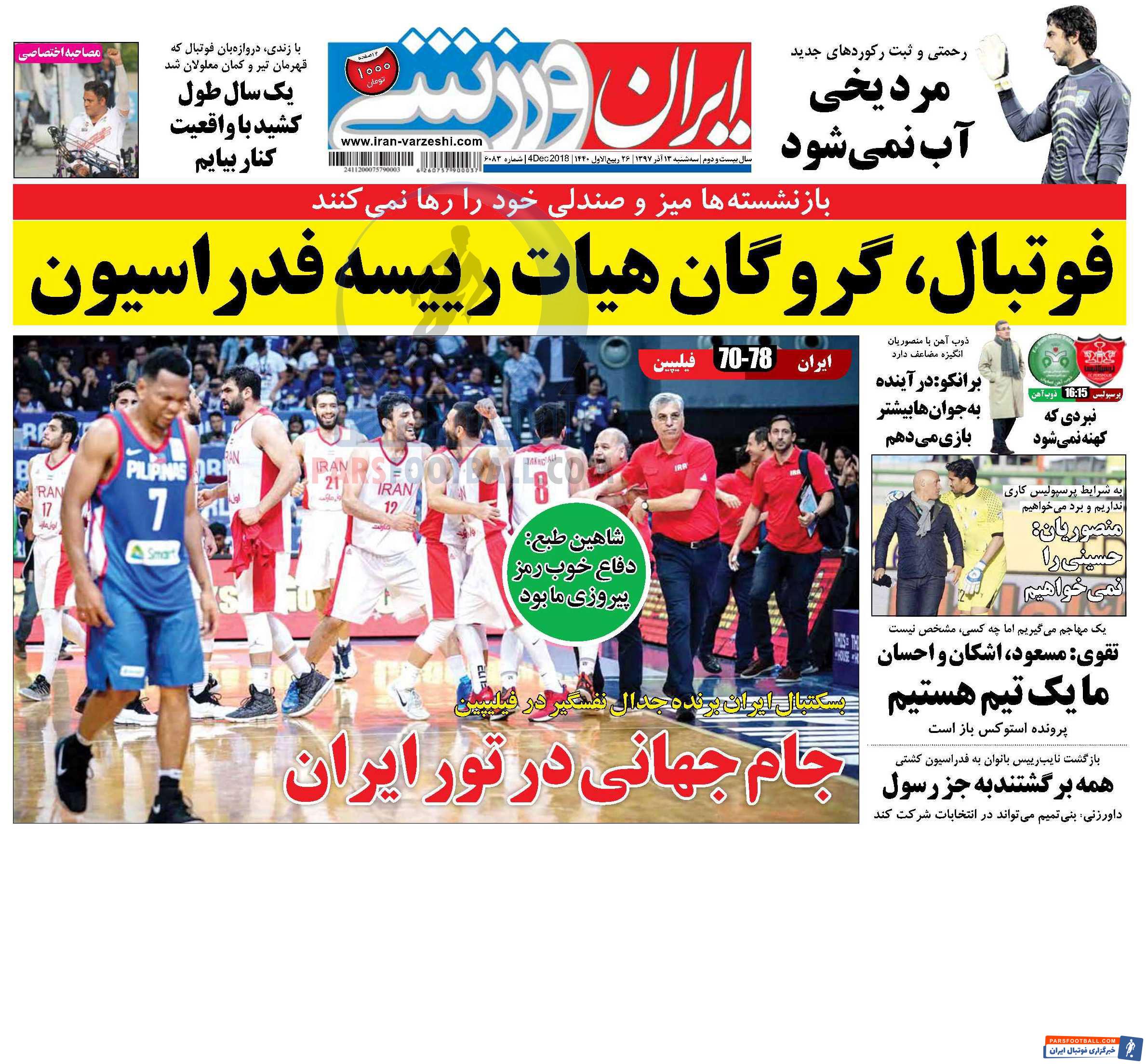 عناوین روزنامه ایران ورزشی سه شنبه ۱۳ آذر ماه به شرح زیر است :