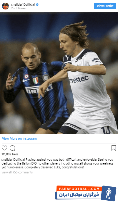 وسلی اسنایدر ستاره سابق تیم ملی هلند و هافبک باشگاه الغرافه قطر که با طارمی هم تیم است در پستی انتخاب شدن مودریچ شاگرد محبوب برانکو به عنوان برنده توپ طلا را تبریک گفت.