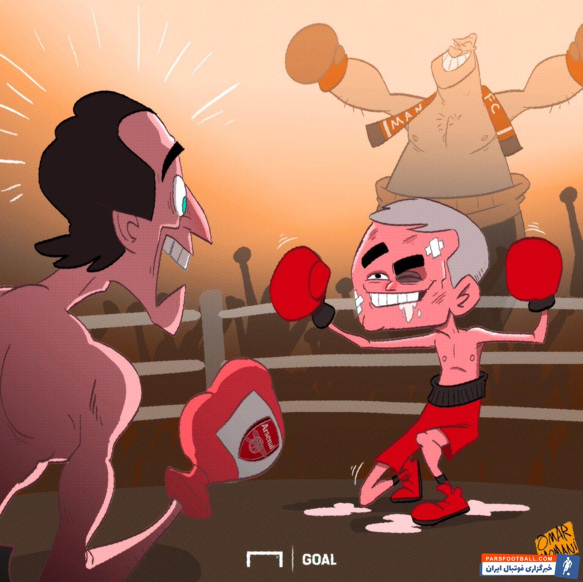 در ششمین تقابل ژوزه مورینیو و اونای امری، سرمربی پرتغالی بازهم شکست نخورد. شب گذشته آرسنال در اولدترافورد دو بار از منچستریونایتد پیش افتاد اما سرانجام این دیدار حساس با تساوی ۲-۲ خاتمه یافت. مورینیو در ۶ دیداری که با تیم هایش مقابل اونای امری صف آرایی کرده به ۴ برد و ۲ تساوی رسیده است. اتفاقات بازی این هفته شیاطین سرخ و توپچی ها، ایده آخرین کاریکاتور عمر مومنی، کاریکاتوریست وبسایت گل بوده است: