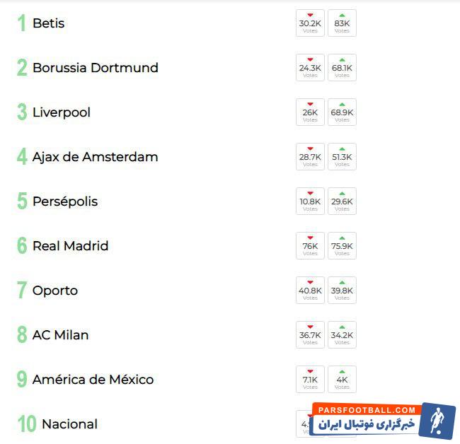 لازم به ذکر است گزینه های این نظر سنجی متشکل از ۳۲ باشگاه پرطرفدار جهان است ، و پرسپولیس به عنوان تنها نماینده قاره آسیا در این نظر سنجی حضور دارد .