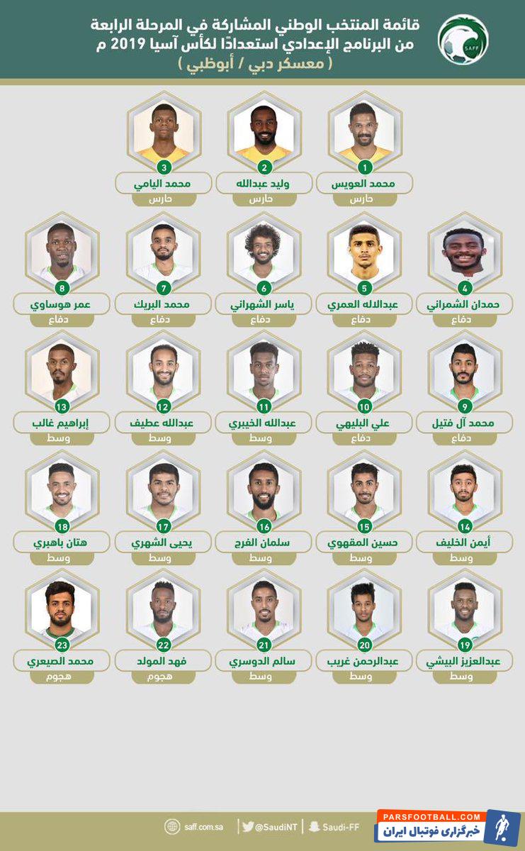 در حالی که اکثر کشورهای حاضر در جام ملت های آسیا هنوز لیست ۲۳ نفره خود برای حضور در رقابت های جام ملت های آسیا را اعلام نکرده اند، فدراسیون عربستان در فاصله ۲۰ روز تا شروع این رقابت ها نام ۲۳ بازیکن نهایی خود را منتشر کرد.