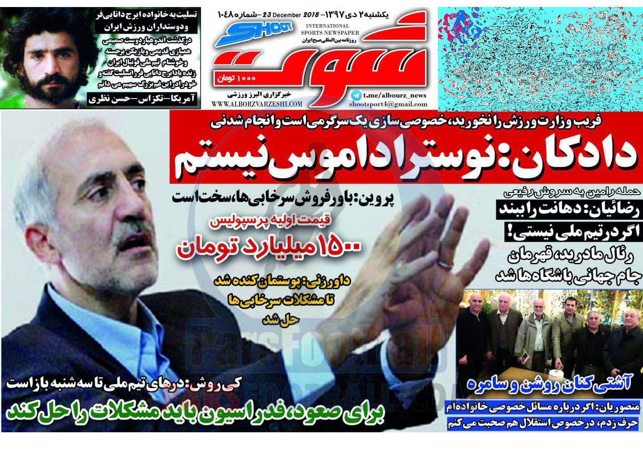 عناوین روزنامه شوت یکشنبه ۲ دی ماه به شرح زیر است :