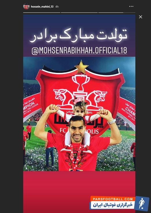 حسین ماهینی کاپیتان دوم تیم فوتبال پرسپولیس با انتشار یک استوری در اینستاگرام خود تولد ربیع خواه را تبریک گفت . تصویری از استوری اینستاگرام ربیع خواه را در ادامه مشاهده می کنید.