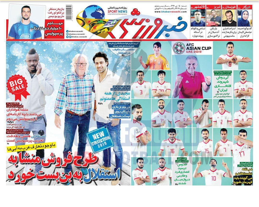 عناوین روزنامه خبر ورزشی شنبه ۱۵ دی ماه به شرح زیر است :