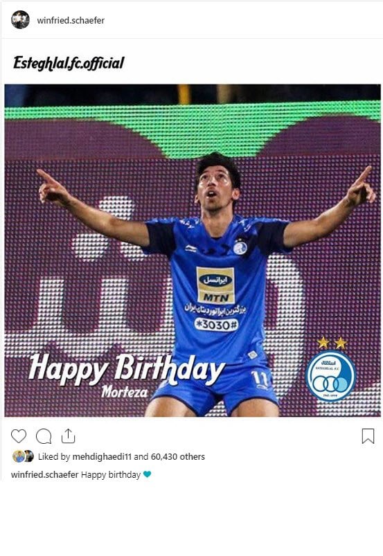 وینفرد شفر سرمربی تیم فوتبال استقلال تهران با انتشار تصویری از مرتضی تبریزی تولد او را تبریک گفت . این بازیکن در نیم فصل اول لیگ برتر نتوانست توانایی های خود را به خوبی در استقلال نشان دهد و به همین دلیل با بدشانسی مورد توجه شفر قرار نگرفت . شفر با انتشار این تصویر به نوعی حمایت خود را از این بازیکن برای نیم فصل دوم اعلام کرده است .