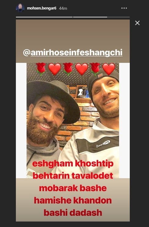 محسن بنگر با انتشار یک استوری در اینستاگرام خود تولد امیرحسین فشنگچی را به او تبریک گفت .