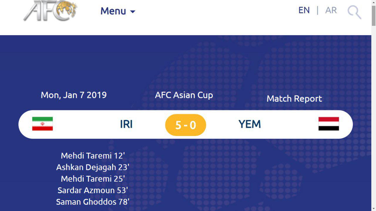 شاگردان کارلوس کیروش در حالی امشب نخستین بازی در جام ملتهای آسیا را با برتری ۵ بر صفر مقابل یمن پشت سر گذاشتند که وب سایت و صفحات مجازی کنفدراسیون فوتبال آسیا و همچنین اسکوربورد پخش زنده تلویزیونی مسابقات، زننده گل دوم ایران را دروازهبان یمن معرفی کرد. جدا از اینکه سایت کنفدراسیون فوتبال آسیا گل دوم تیم ملی برابر یمن را به دلیل برخورد توپ به کمر سعود السوادی، به نام او به ثبت رساند، باکس اعلام نتیجه در پخش تلویزیونی هم ضمن اعلام این گل به خودی، زمان آن را نیز به اشتباه در دقیقه ۴ مسابقه درج کرده بود که این مسئله حتی تا پس از پایان بازی ادامه داشت. با گذشت حدود ۳۰ دقیقه پس از پایان مسابقه تیم ملی ایران برابر یمن، سایت کنفدراسیون فوتبال آسیا در تمام بخشها و صفحات مجازی خود نام زننده گل دوم را تغییر داد و آن را به نام اشکان دژاگه ، کاپیتان تیم ملی ثبت کرد.