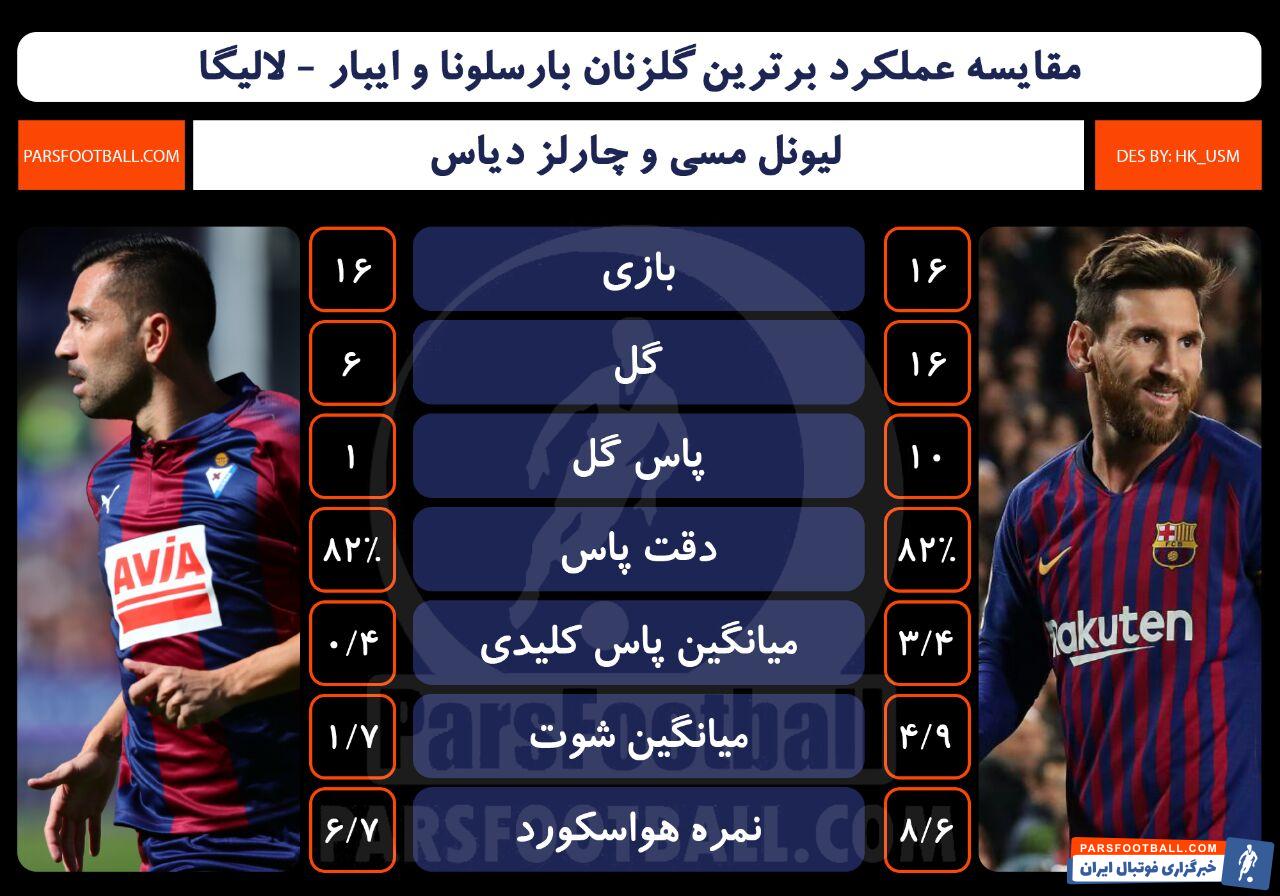 دو تیم بارسلونا و ایبار از رقابت های لالیگا اسپانیا به مصاف هم می روند و به بررسی عملکرد لیونل مسی و چارلز دیاس، بازیکنان دو تیم بارسلونا و ایبار می پردازیم.