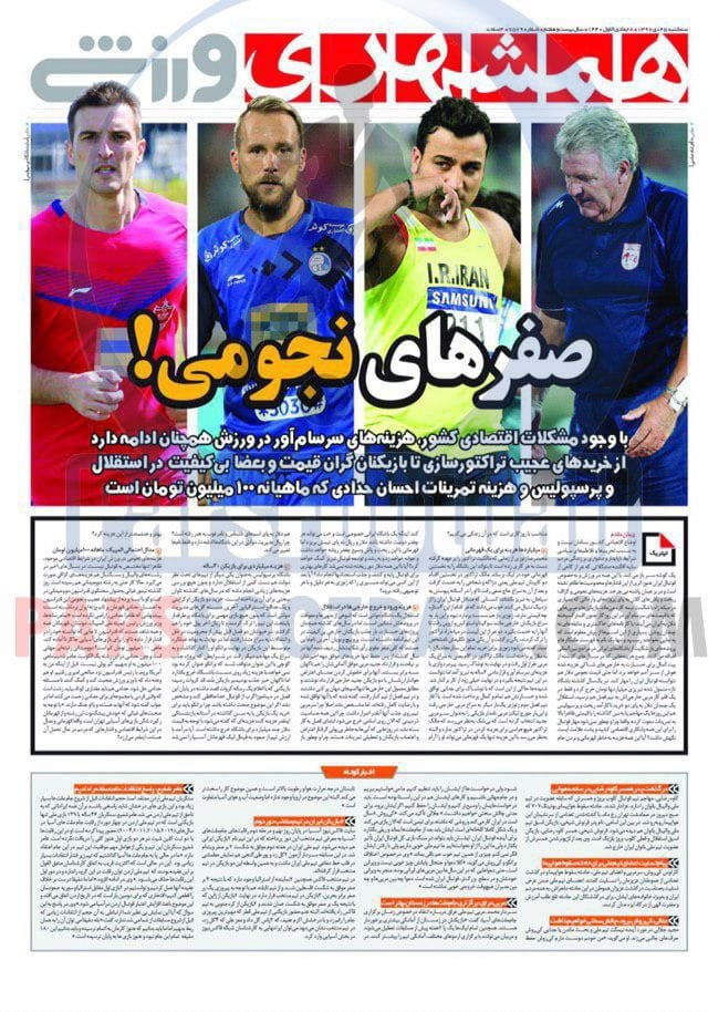 عناوین روزنامه همشهری ورزشی سه شنبه ۲۵ دی ماه به شرح زیر است :