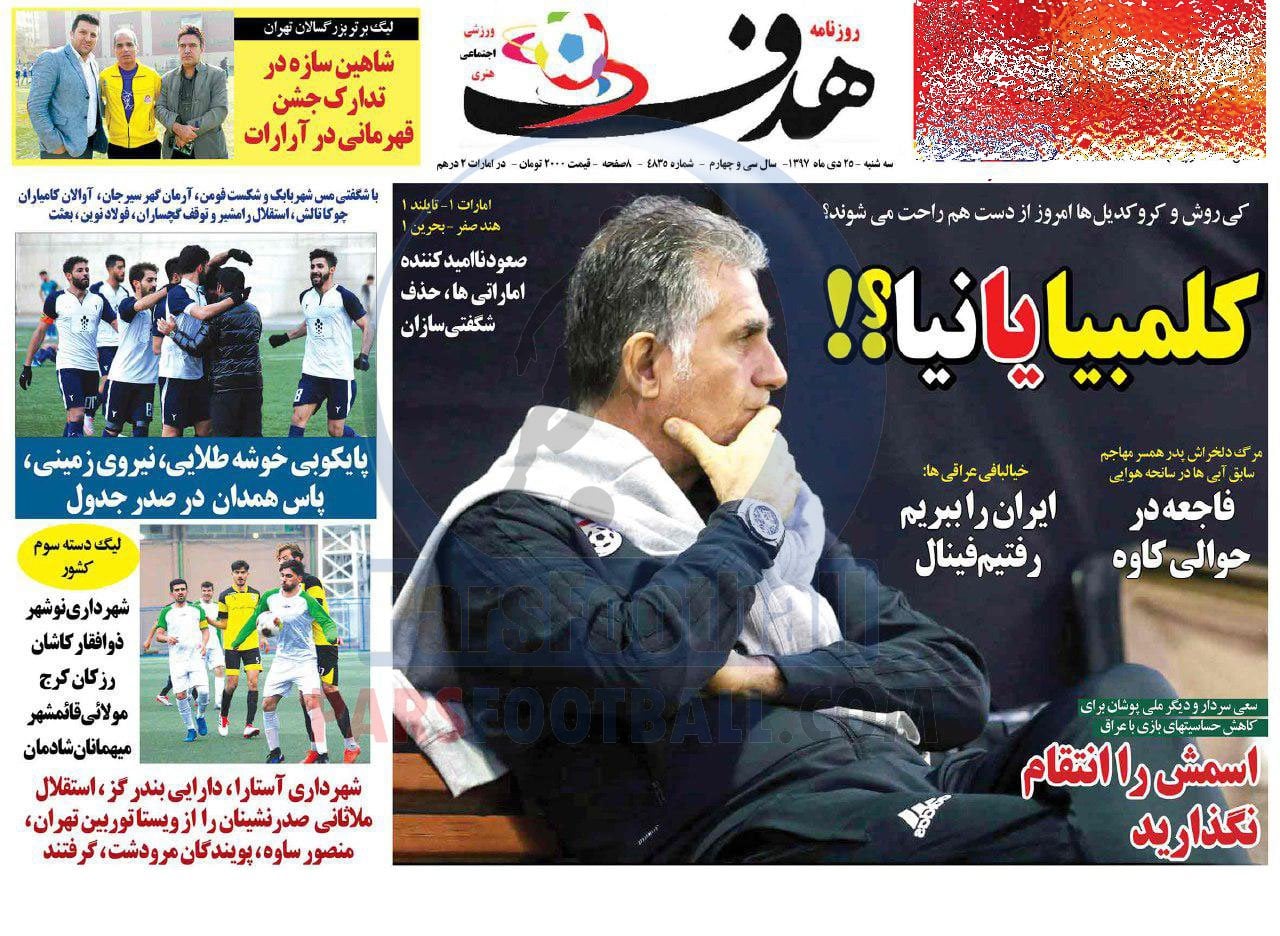 عناوین روزنامه هدف ورزشی سه شنبه ۲۵ دی ماه به شرح زیر است :