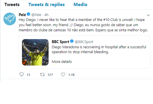 پله، اسطوره فوتبال برزیل در صفحه توئیتر خود پیغامی برای دیگو مارادونا ارسال کرد.