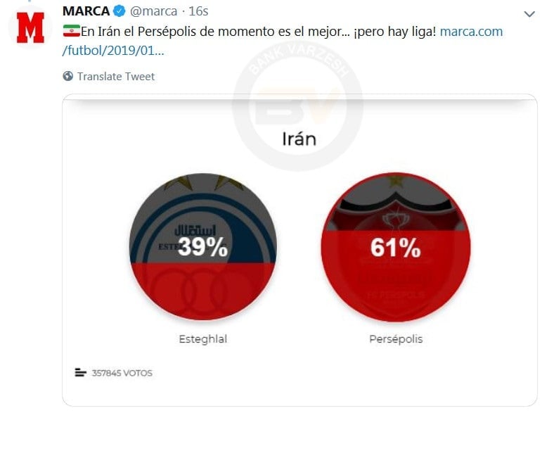 روزنامه مارکا از رو گذشته اقدام به نظرسنجی از هواداران فوتبال در جهان کرد تا بهترین تیم در یک کشور را معرفی کند. از ایران، تیمهای استقلال و پرسپولیس در این نظرسنجی قرار دارند و تاکنون بیش از ۳۵۷ هزار کاربر در آن رای دادهاند.