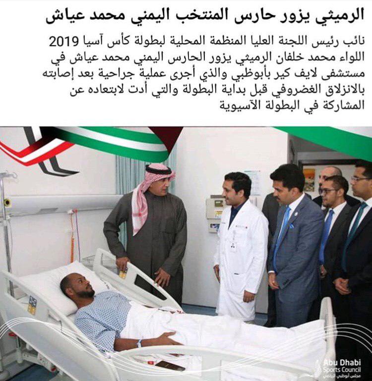 روز گذشته محمد خالفان الرمیثی نایب رییس وزارت ورزش عربستان با حضور در بیمارستان ابوظبی از گلر مصدوم یمن عیادت کرد و دقایقی با او به صحبت پرداخت. رمیثی برای عیاش آرزوی سلامتی کرد و همچنین از عملکرد او تمجید کرد.