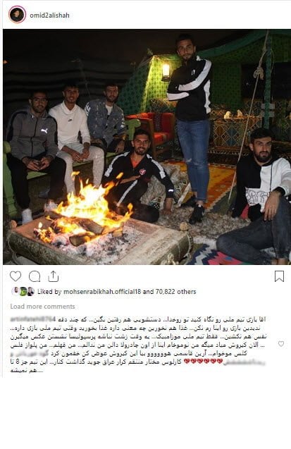 در صفحه اینستاگرامی امید عالیشاه بازیکن پرسپولیس پست جدیدی ار امید عالیشاه منتشر شده که با دیگر بازیکنان پرسپولیس در حال تفریح در یک چادر هستند . اما موضوع قابل تامل کامنت کاربری در زیر پست است که با حمله به کی روش و انتقاد از بازی تیم ملی برابر عراق حرف های رکیکی نوشته است که پارس فوتبال به جهت ملاحظات اخلاقی این الفاظ را از روی کامنت این فرد حذف کرده است.
