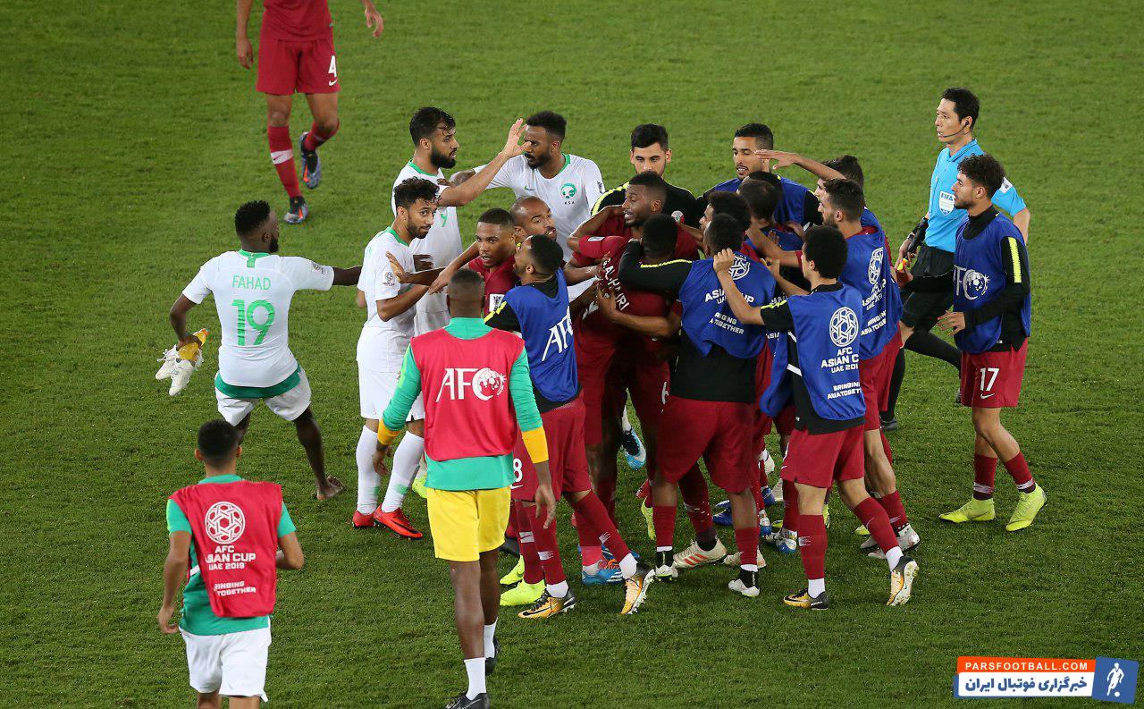 هر چند مسئولان فدراسیون فوتبال آسیا تلاش کردند تا با نشان دادن تصاویر دست دادن بازیکنان و اجرایی کردن پرتکل مسابقات از حساسیت های دیدار تیم ملی عربستان و تیم ملی قطر کم کنند اما در نهایت آن چیزی که انتظار می رفت اتفاق افتاد و بعد از یک جدال فیزیکی و جذاب، بازیکنان دو تیم درگیر شدند.