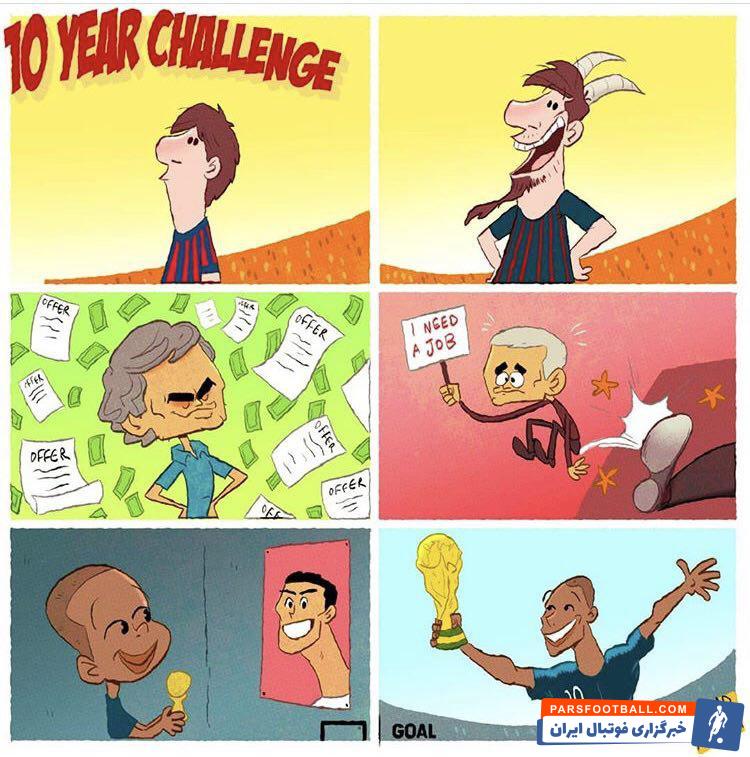 این روزها به شکل فراگیری در فضای مجازی، چالش ۱۰ سال پیش راه افتاده و افراد به مقایسه عکس ها و دستاوردهای سال ۲۰۱۹ خود با ۲۰۰۹ می پردازند. در همین راستا عمر مومنی، کاریکاتوریست وبسایت گل نیز با الهام گرفتن از این چالش، جدیدترین کاریکاتور خود را منتشر کرده است. لیونل مسی و ژوزه مورینیو همچون همیشه عضو ثابت کاریکاتورهای او هستند و کیلیان ام باپه نیز دیگر سوژه او در این کاریکاتور است: