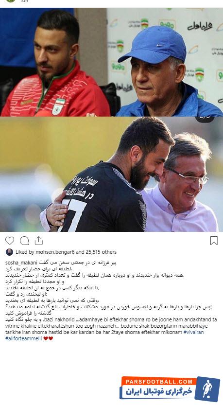 سوشا مکانی دروازه بان پیشین پرسپولیس و تیم ملی با انتشار تصویری از برانکو و کی روش ، از هر دو مربی خارجی ایران تمجید کرد . سوشا مکانی در این پست نوشت :