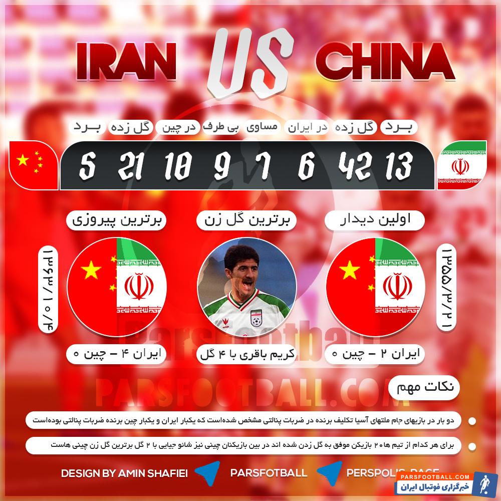 چینی ها تا کنون در پنج دیدار مقابل ایران به پیروزی رسیده اند و تیم ملی ایران تاکنون در سیزده دیدار مقابل تیم ملی چین به پیروزی رسیده است.