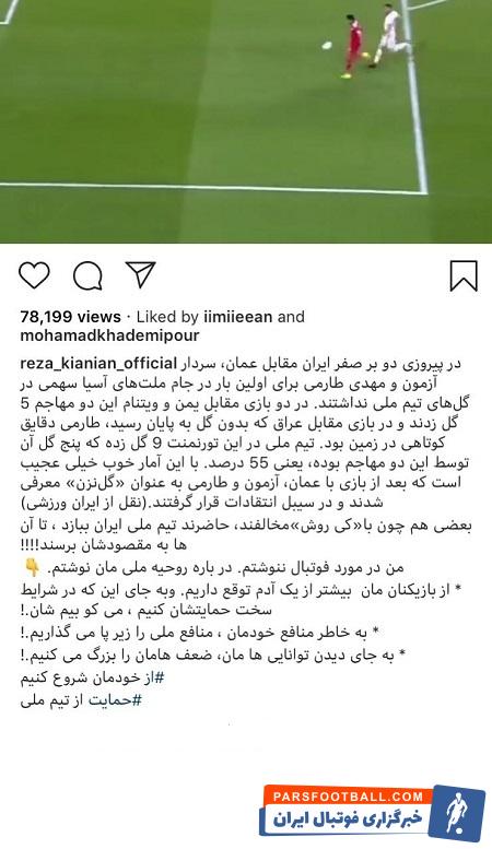 پست اینستاگرامی رضا کیانیان در واکنش به برخی انتقادات از تیم ملی