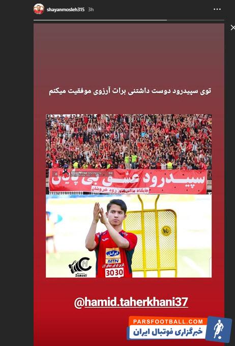 شایان مصلح مدافع تیم فوتبال پرسپولیس با انتشار یک استوری در اینستاگرام خود برای حمید طاهر خانی آرزوی موفقیت کرد. تصویری از استوری مصلح را در ادامه مشاهده می کنید.