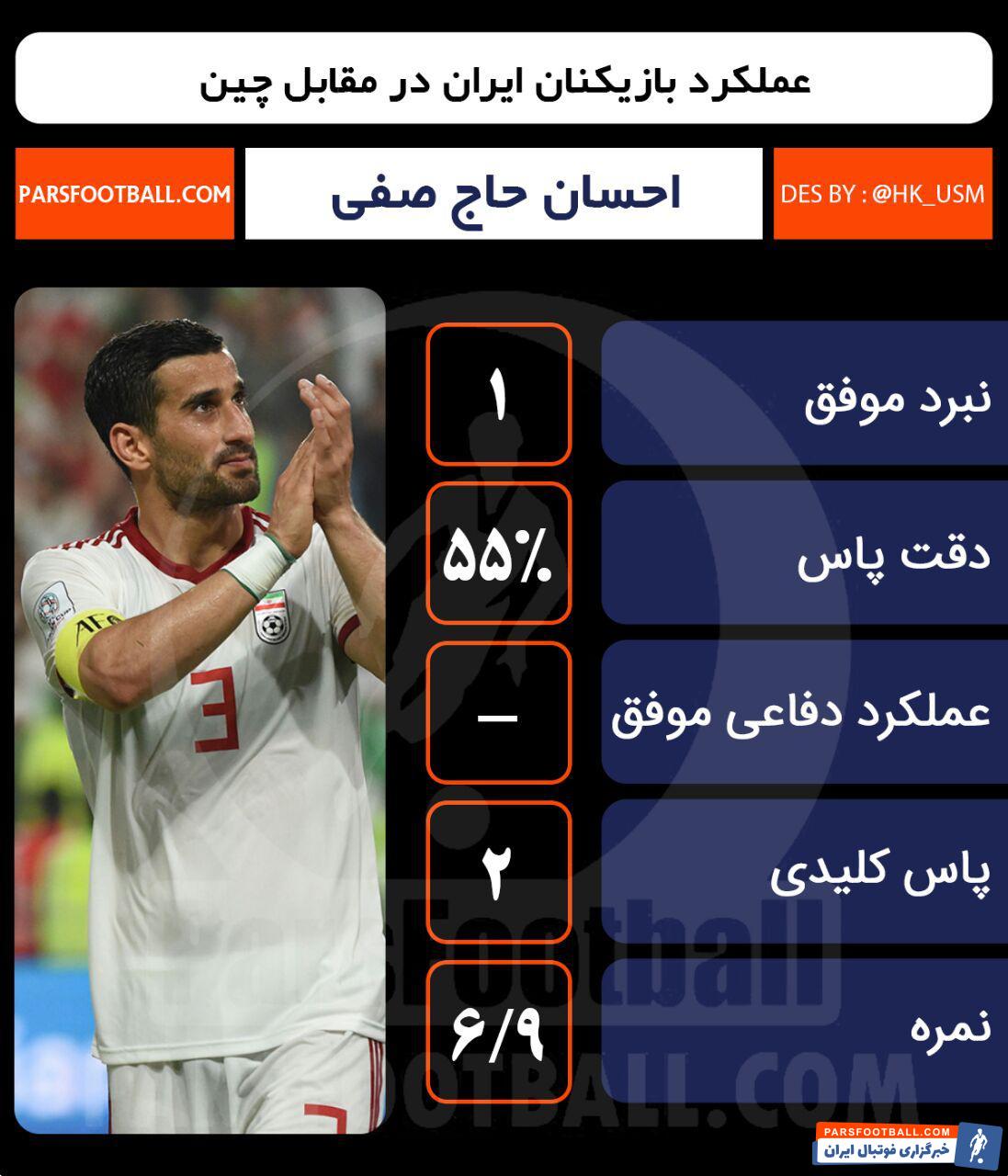 احسان حاجصفی بعد از مدتها در وسط زمین برای ایران به میدان رفت تا جای خالی امیری را پر کند. اما عملکرد او چندان درخشان نبود. او نمره نسبتا خوب ۶٫۹۲ را دریافت کرد، اما اگر ۲ پاس کلیدی در جریان بازی نبود، او مطمئنا پایینترین نمره را بین بازیکنان ایران میگرفت.