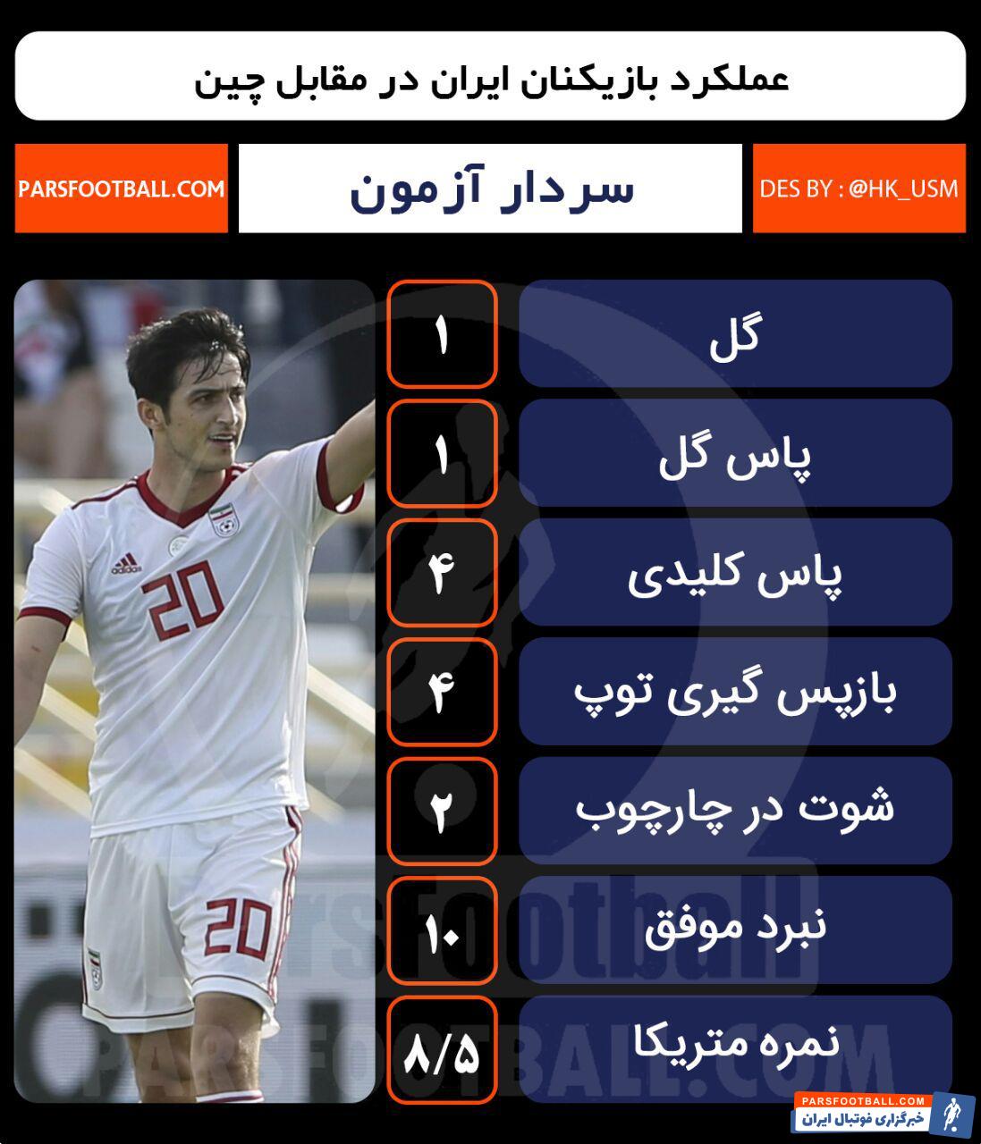 سردار آزمون در یکی از بهترین روزهای ملی خود، با کسب نمره ۸٫۵۱، بهترین بازیکن زمین دیدار ایران – چین شد. غیر از گلزنی و ارسال یک پاس گل دیگر، او در چندین فاکتور مهم و تاثیرگذار بهترین بازیکن ایران بود.