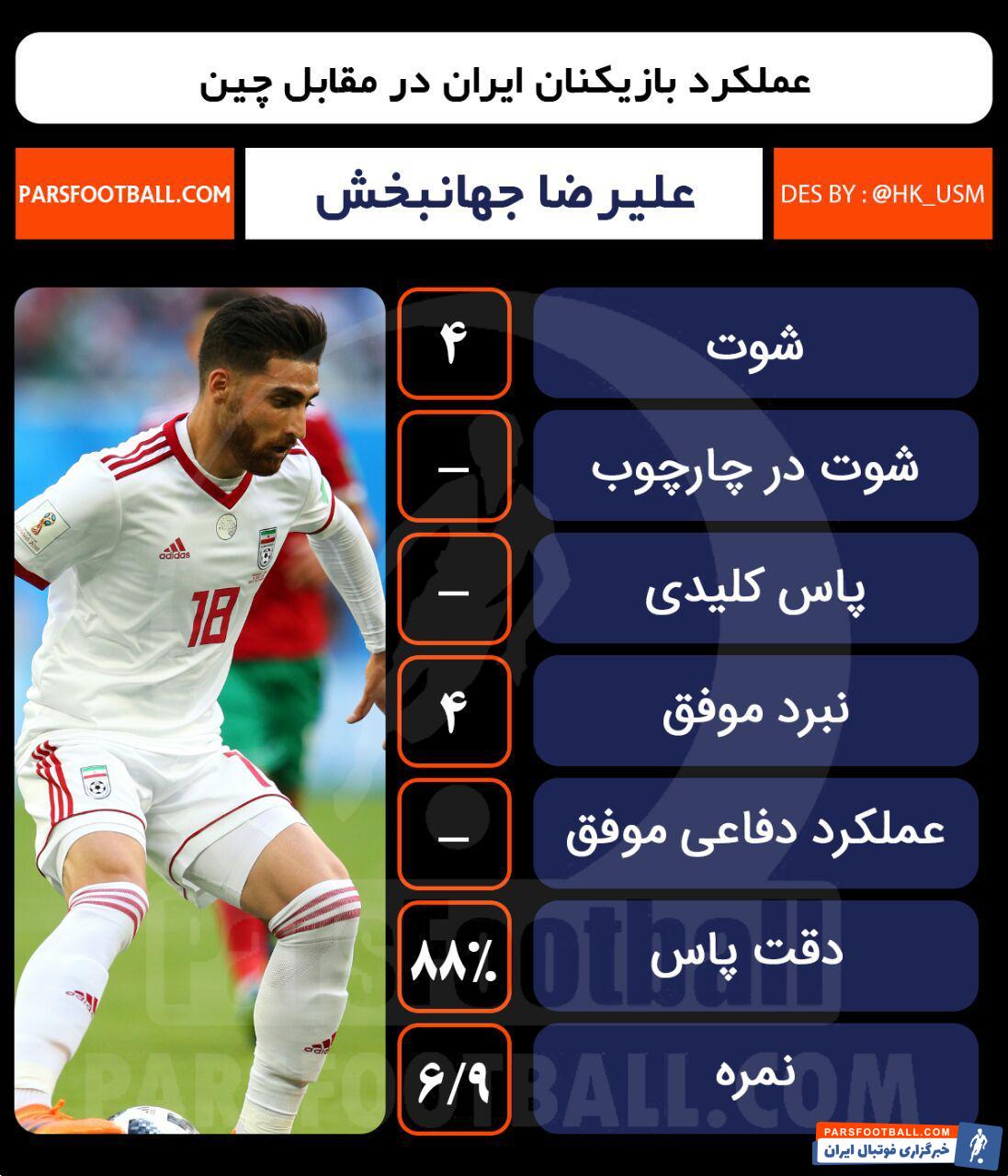 علیرضا جهانبخش پایینترین نمره را در بازی چین گرفت. نمرهای که البته خودش، یک نمره نه چندان بد است (۶٫۹۰). علیرضا در امر پرسینگ، مانند بازی قبلی موثر کار کرد و نقش ویژهای در فشار مداوم ایران روی مدافعان چین ایفا کرد. در توپی که منجر به گل سردار شد، علیرضا علیرغم قد کوتاهش یک دوئل هوایی را برد و به نوعی روی گل دوم ایران تاثیرش را گذاشت.