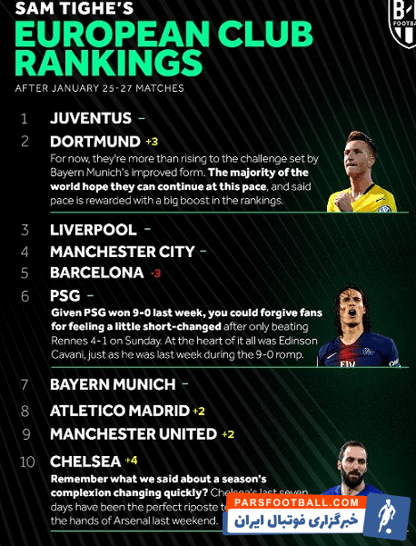 بورسیا دورتموند آلمان به واسطه درخشش ادامه دار در بوندس لیگا و تداوم صدرنشینی در رده دوم قرار گرفته است و جای بارسلونا را گرفته است.