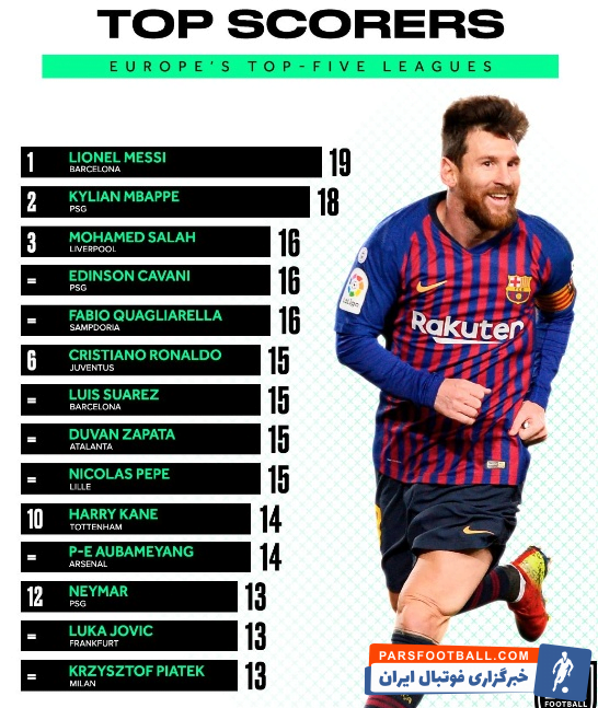 با پایان یافتن هفته اخیر لیگهای اروپایی، ردهبندی برترین مهاجمان اعلام شد که بر این اساس لیونل مسی با توجه به گلی که در دیدار اخیر بارسلونا شب گذشته مقابل خیرونا به ثمر رساند با ۱۹ گل زده در صدر ایستاده است.