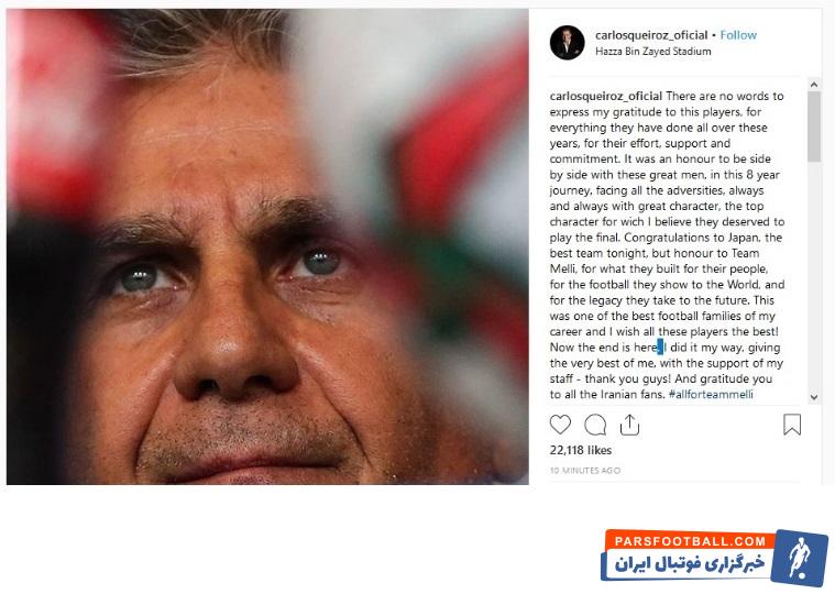 هیچ واژهای برای قدردانی از این بازیکنان وجود ندارد؛ بابت همه کارهایی که در طول این سالها انجام دادند؛ تلاشهایشان، حمایتشان و و تعهدی که داشتند. افتخاری بود که در این سفر ۸ ساله، کنار این مردان بزرگ باشم، با همه دغدغهها، همیشه و همیشه با شخصیتی فوقالعاده، بالاترین شخصیت، که معتقدم لیاقت حضور در فینال را داشتند. تبریک به ژاپن، بهترین تیم امشب. اما افتخار برای «تیم ملی» است، بهخاطر آنچه که برای مردمشان ساخت، برای فوتبالی که به دنیا نشان میدهد و برای میراثی که برای آینده بهجای گذاشت. این یکی از بهترین خانوادههای فوتبالی دوران حرفهای من بود و برای تمام این بازیکنان بهترینها را آرزو دارم! حالا پایان اینجاست؛ آنچه که میتوانستم انجام دادم، حداکثر تلاش در حد و اندازه خودم، البته با حمایت همکارانم. ممنونم رفقا! و از شما سپاسگزارم هواداران ایرانی.