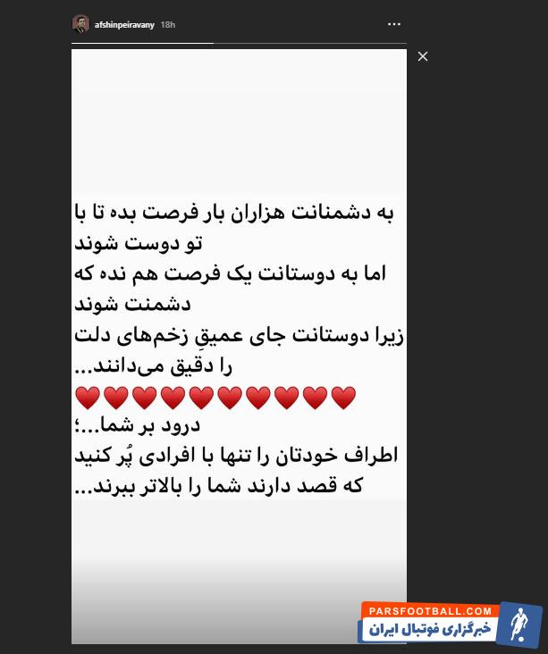 افشین پیروانی پیشکسوت پرسپولیس استوری معناداری را در اینستاگرام خود منتشر کرد. تصویری از استوری پیروانی را در ادامه مشاهده می کنید.