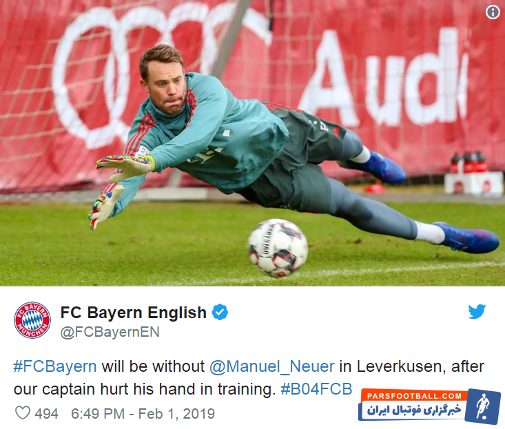 بایرن مونیخ  در بوندس‌لیگا در حالی در این چند هفته به میدان رفته که مانوئل نویر، کاپیتان و سنگربان اصلی خود را در چند دیدار در اختیار نداشته . چرا که سنگربان اصلی تیم ملی آلمان و بایرن مونیخ در تمرینات از ناحیه دست دچار آسیب‌دیدگی شده است. این خبر را حساب توییتر رسمی باشگاه بایرن مونیخ هم اعلام کرد.