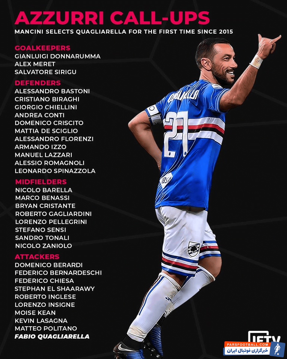 در همین راستا روبرتو مانچینی لیست بازیکنان تیم ملی را اعلام کرد که حضور نام فابیو کوالیارلا مهاجم آماده و ۳۵ ساله سامپدوریا در این لیست مشاهده میشود.