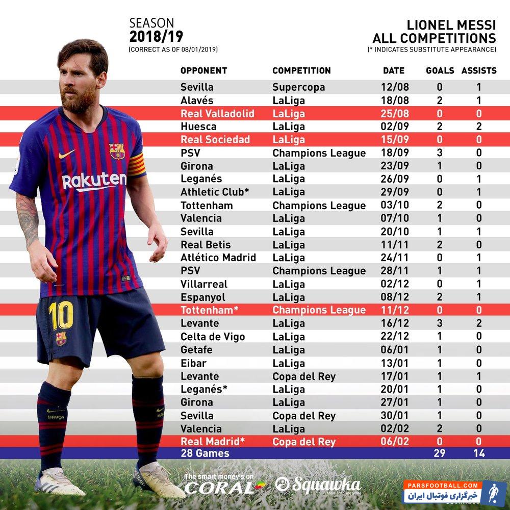 لیونل مسی در بازی چهارشنبه شب بارسلونا و رئال مادرید بعد از اینکه وارد زمین شد نه گلی زد و نه پاس گلی به هم تیمی هایش داد. این اتفاق باعث شد آمار جالبی از بازی هایی منتشر شود که مسی در آنها نه گل زده و نه پاس گل داده. چنین اتفاقی فقط ۴ بار در این فصل برای فوق ستاره آرژانتینی بارسلونا رخ داده. آن هم در شرایطی که مسی ۲ بازی از این ۴ بازی را نیمکت نشین بوده!