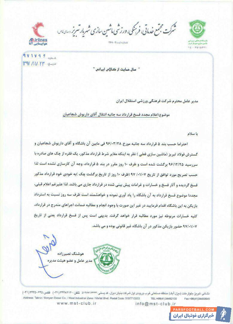 تصویر آخرین مکاتبه باشگاه فرهنگی ورزشی ماشینسازی تبریز با استقلال تهران جهت انجام مفاد قرارداد به پیوست میباشد.