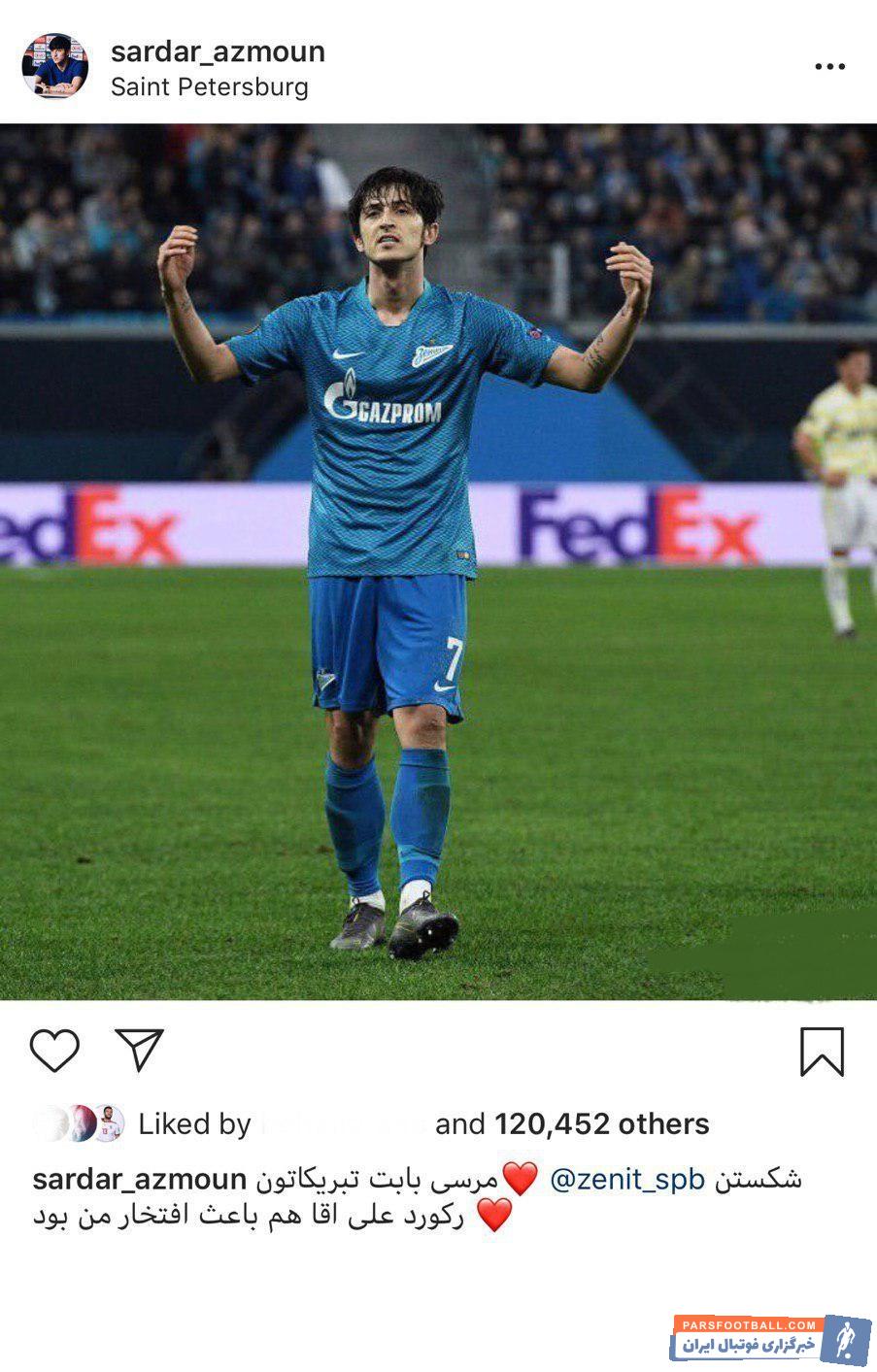 سردار آزمون مهاجم آماده ملی پوش ایران و باشگاه زنیت روسیه که در چهارچوب مسابقات لیگ اروپا شب گذشته دو گل را به ثمر رساند با انتشار پستی در صفحه شخصی خودش نسبت به این دو گل واکنش نشان داد.