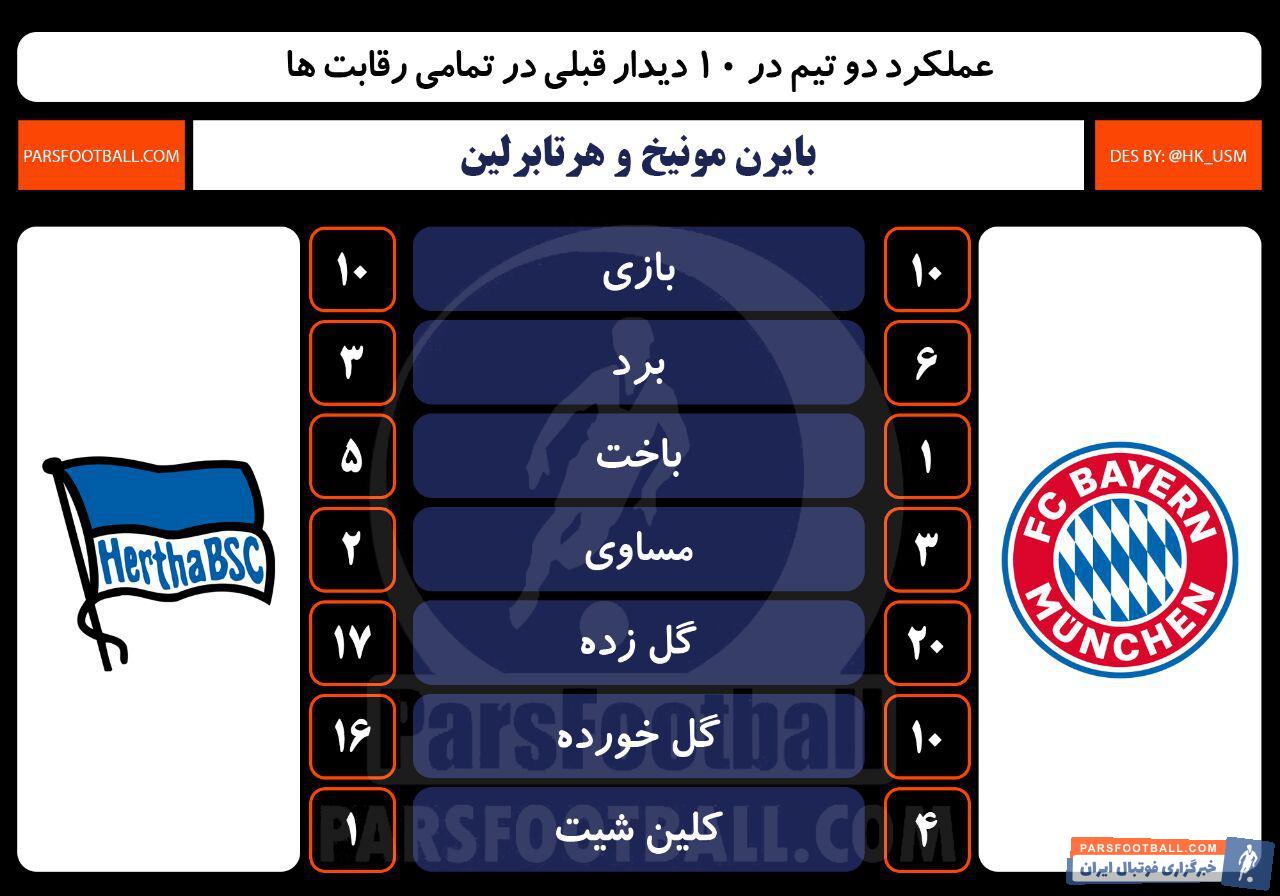 دو تیم فوتبال بایرن مونیخ و هرتابرلین در رقابت بوندسلیگا آلمان به مصاف هم خواهند رفت. به بررسی عملکرد دو تیم در ده دیدار اخیر می پردازیم.